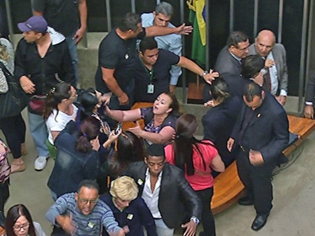 Uma participante chegou a cuspir em um dos seguranças da Câmara, o que iniciou um tumulto no local.