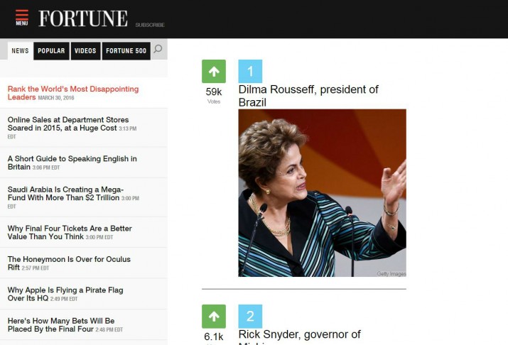 Expelida do ranking da revista Fortune que classificou os 50 líderes mais influentes do mundo neste ano, Dilma Rousseff está fazendo bonito em outra lista organizada pela publicação. A presidente brasileira disparou na ponta do ranking que agrupa os 19 líderes mais decepcionantes do planeta neste outono de 2016.