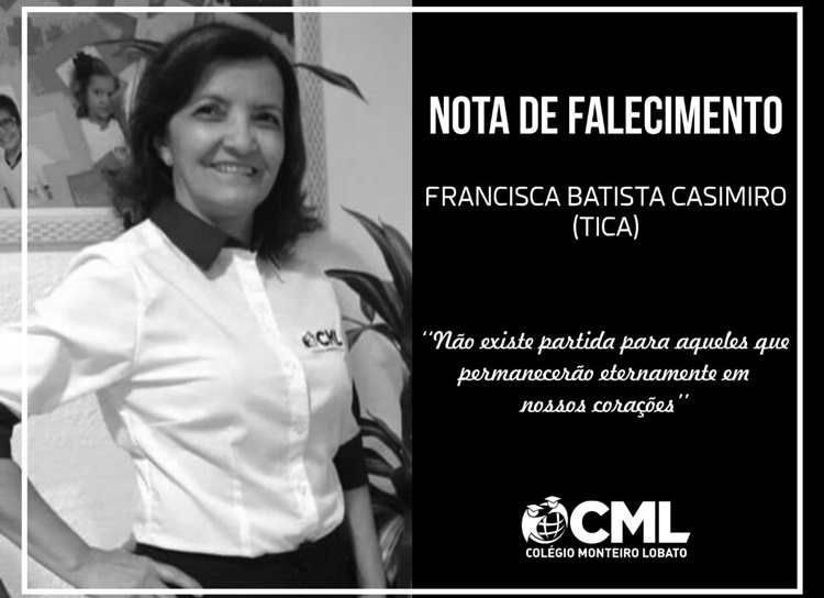 Morreu nesta quarta-feira (03) a sousense Francisca Batista Casimiro, mais conhecida como “Tica”, que tinha 50 anos e era secretária do Colégio Monteiro Lobato (CML) na cidade de Sousa.