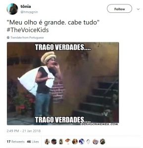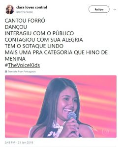 Eduarda Brasil, de 15 anos, mostrou personalidade em sua participação no “The Voice Kids”, neste domingo (21/1). Paraibana de São José de Piranhas, a adolescente deu uma tirada em Claudia Leitte após aprovação dos quatro jurados. A participante interpretou “Forró do Xenhenhém”, de Elba Ramalho.