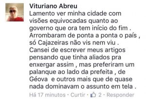 A oposição de Cajazeiras parece que não se entende e começa a ‘bater cabeça’, foi assim que a população entendeu, pois após as manifestações pró-Dilma nesse sábado (16), em Cajazeiras, onde foi realizada uma carreata contra o processo de impeachment da presidente Dilma Rousseff (PT) e pela democracia brasileira, o ex-deputado Vituriano de Abreu (PMDB) usou a rede social Facebook para se posicionar contrário ao movimento.