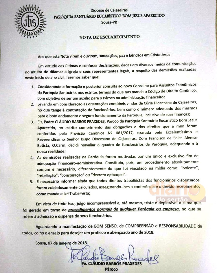 O Padre Cláudio Praxedes, enviou nota ao Portal Diário do Sertão para esclarecer as demissões de três funcionários da Paróquia Santuário Eucarístico Bom Jesus Aparecido na cidade de Sousa.