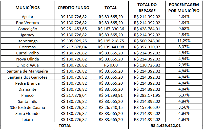 Nesta segunda-feira (20) foi disponibilizado o segundo repasse do primeiro mês do ano. Os municípios da região do Vale do Piancó receberam R$ 4.429.422,01. No último repasse do dia 10 a região do Vale foi de R$ 9.135.797,84.