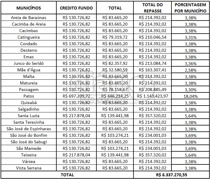 Nesta segunda-feira (20) foi disponibilizado o segundo repasse do primeiro mês do ano. Os municípios da região de Patos receberam R$ 6.337.270,55. No último repasse do dia 10 a região de Patos foi de R$ 12.699.869,64.