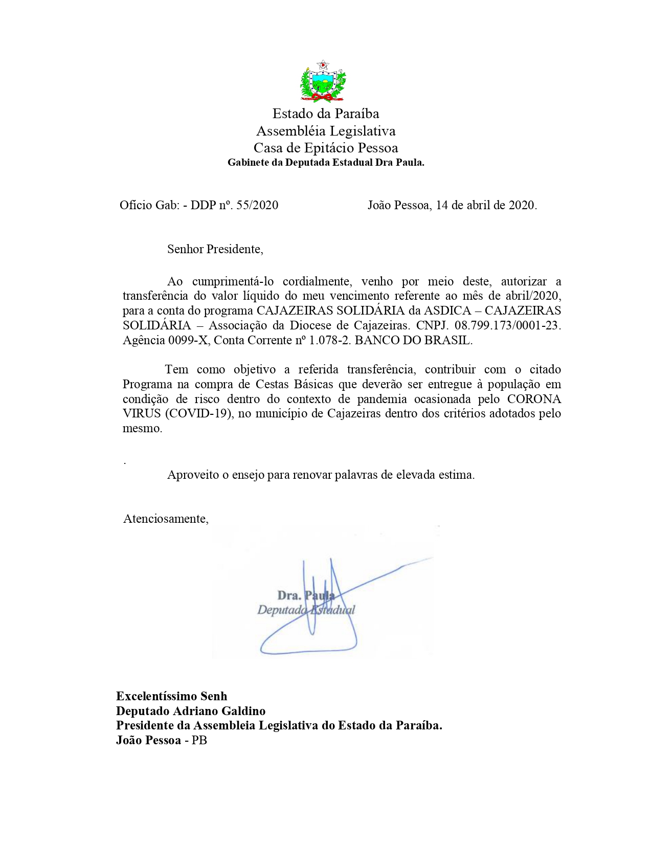 A deputada estadual Doutora Paula Francinete (PP), anunciou nesta terça-feira (14) que autorizou, o presidente da Assembleia legislativa da Paraíba, deputado Adriano Galdino (PSB), a promover a transferência do valor integral do seu salário, referente ao mês de abril de 2020, para a conta da campanha ‘Cajazeiras Solidária’, da Associação da Diocese de Cajazeiras.