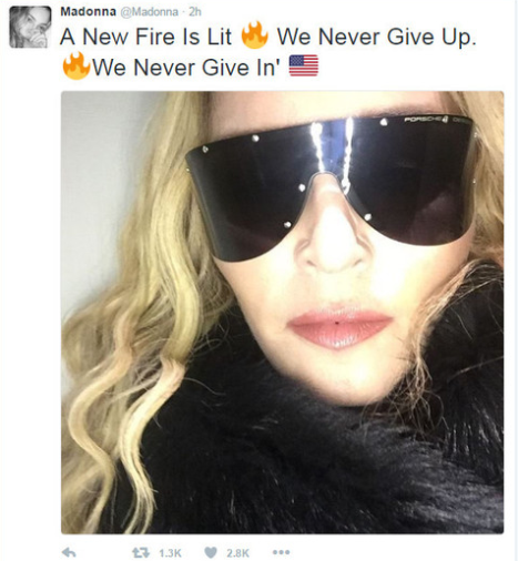 Madonna, que apoiou abertamente a democrata, soltou uma mensagem de esperança: “Um novo fogo foi aceso. Nunca desistiremos. Nunca nos entregaremos”