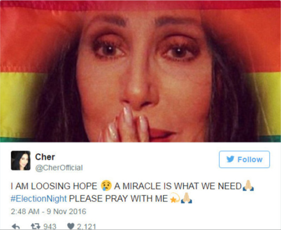 A cantora e atriz Cher, antes da vitória de Trump se concretizar, escreveu: “Estou perdendo a esperança. Precisamos de um milagre. Por favor, orem comigo”