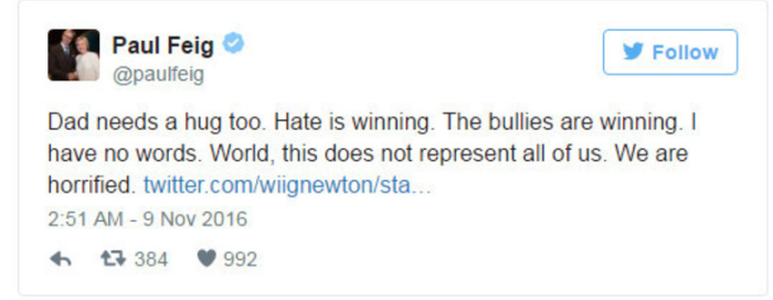 Paul Feige, diretor de Caça-Fantasmas, foi ao Twitter para mostrar sua decepção: “O papai precisa de um abraço também. O ódio venceu. Os agressores venceram. Mundo, isso não nos representa. Estamos horrorizados”