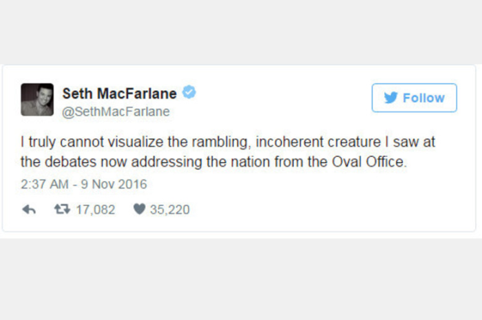 O ator e produtor Seth McFarlane também se manifestou: “Eu realmente não consigo visualizar esta criatura incoerente que vi nos debates agora comandar nossa Nação a partir da Sala Oval”
