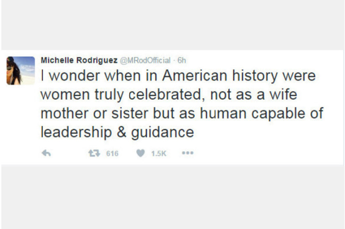 A atriz Michelle Rodriguez, ativista de causas LGBT, se manifestou e não ficou nada contente com a vitória do republicano. Sobre Hillary ter perdido a eleição, ela disse: “Fico pensando quando, na história da América, as mulheres foram celebradas verdadeiramente não como esposas, mulheres ou irmãs, mas como um ser humano capaz de liderar e mostrar caminhos”