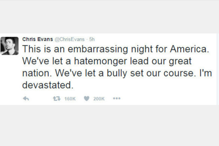 Chris Evans, o Capitão América do cinema, lamentou fortemente a vitória de Trump: “Esta é uma noite vergonhosa para a América. Deixamos um semeador da discórdia comandar nossa grande nação. Deixamos um agressor determinar nosso caminho. Estou arrasado”