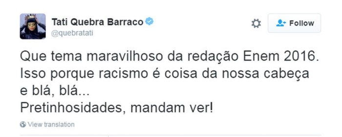 Tati Quebra Barraco elogia tema da redação (Foto: Reprodução/Twitter)