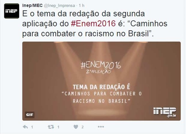 O tema da redação da segunda aplicação do Enem 2016 é “Caminhos para combater o racismo no Brasil”. A informação foi divulgada nas redes sociais pelo Instituto Nacional de Estudos e Pesquisas Educacionais (Inep), no início da tarde deste domingo (4).