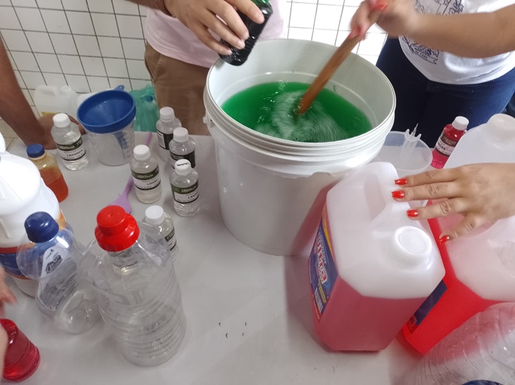 “Aqui nós produzimos sabões, detergentes, desinfetantes e outros materiais utilizados na limpeza, e o mais importante é que muitos materiais que seriam descartados no lixo são aproveitados na fabricação dos produtos a exemplo do óleo de fritura que ao ser descartado nas pias, poderia causar entupimento e poluição das águas, e as garrafas plásticas que em vez de serem jogadas no lixo, são aproveitadas para armazenamento dos produtos”, explicou o professor.