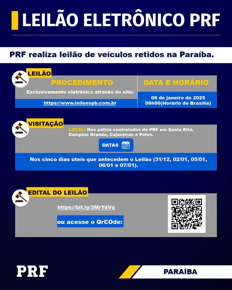O leilão será exclusivamente eletrônico, por meio do site do leiloeiro oficial (www.leiloespb.com.br). O edital completo e a relação dos lotes estão disponíveis no portal da PRF e no site do leiloeiro.