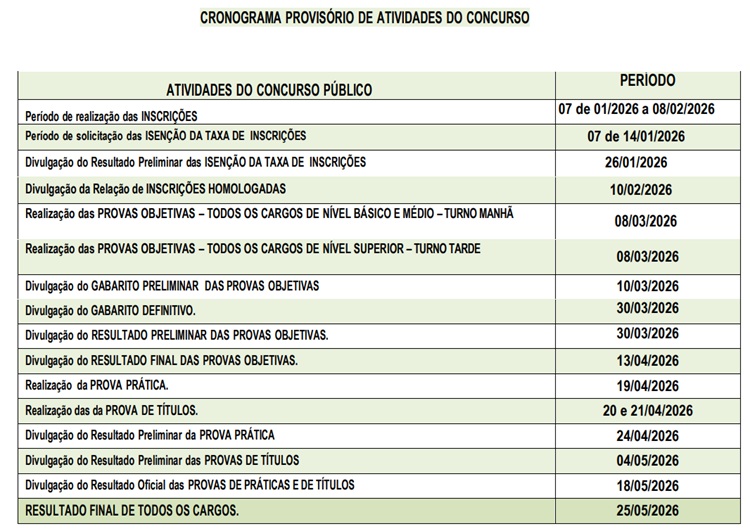 As provas objetivas estão previstas para o dia 8 de março. No período da manhã serão aplicadas as avaliações para os candidatos de nível básico e médio/técnico, e no turno da tarde, nível superior.