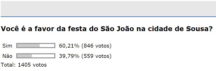O Portal Diário do Serão realizou enquete no período de 06 de a 07 de maio do ano em curso com a seguinte pergunta: Você é a favor da festa do São João na cidade de Sousa?. 1,4 mil internautas participaram do questionamento que ficou no ar por 24 horas.