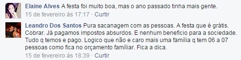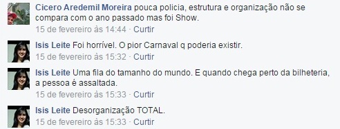 O internauta Cicero Moreira reclamou da falta de estrutura e pouco policiamento. Isis Leite considerou o pior carnaval da história.