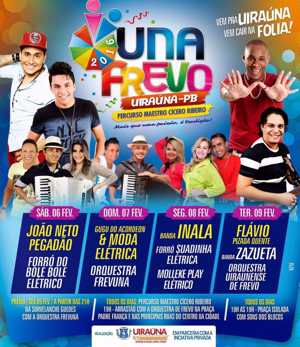 O prefeito da cidade de Uiraúna, Segundo Santiago (PTB), anunciou em uma coletiva de imprensa nessa terça-feira, a programação do Carnaval 2016. O evento terá 11 atrações musicais.