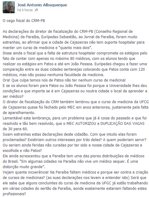 Um dos defensores do curso em Cajazeiras, o membro do Movimento dos Amigos de Cajazeiras (MAC), o professor José Antonio taxou de “cego” o fiscal do CRM, e justificou: “Que culpa temos nós de Patos não ter nenhum curso de medicina!"