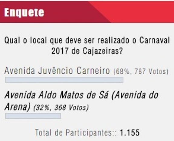 No geral, contabilizando os resultados dos dois sites o total de votantes foi de 4.561 votantes, onde 2.827 (61.98%) escolheram a Avenida Coronel Juvêncio Carneiro para ser o local da realização do Carnaval 2017. Já 1.734 (38.02%) optaram pela Avenida Aldo Matos de Sá (Avenida da Arena).