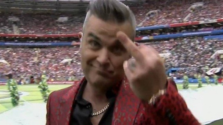 O cantor Robbie Williams pode ter que pagar uma multa por mostrar o dedo do meio durante a performance na cerimônia de abertura da Copa. Uma nova legislação, aprovada pelo presidente russo Vladimir Putin em maio, prevê a sanção para aqueles que xingarem em público. E o uso de “linguagem obscena” é banido no país desde 2014.