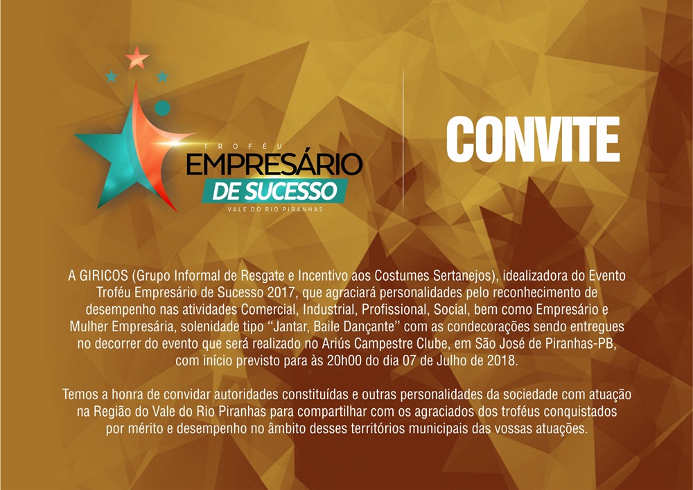 O Grupo Informal de Resgate e Incentivo aos Costumes Sertanejos (GIRICOS) divulgou nesta sexta-feira (6), a lista de homenageados do Troféu Empresário de Sucesso Vale do Rio Piranhas.