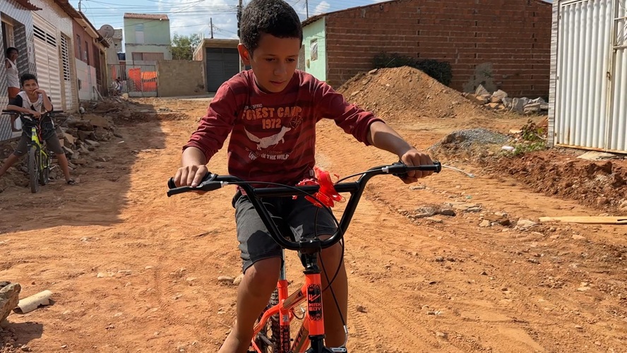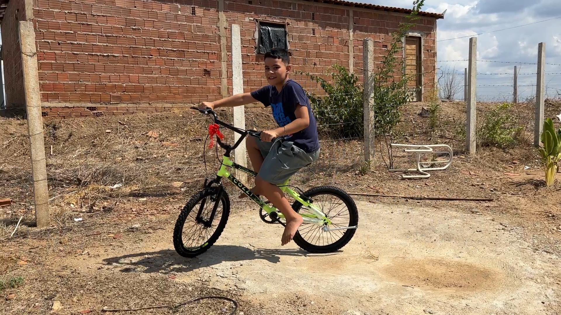 Ainda em Itaporanga, o pequeno Erick dos Santos Ferreira, de 10 anos, também foi contemplado com uma bicicleta – Foto: TV Diário do Sertão