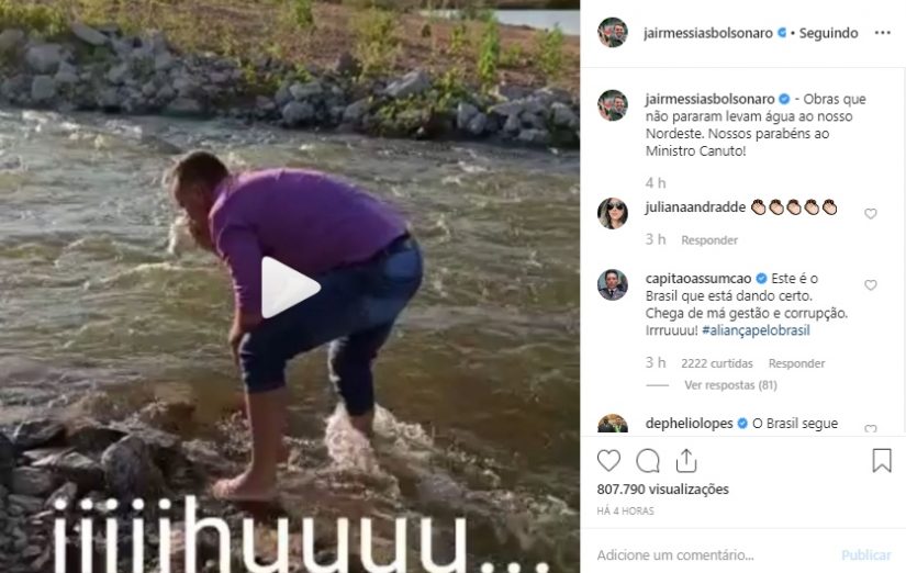 Bolsonaro gostou e postou em suas redes sociais com a legenda: “Obras que não pararam levam água ao nosso Nordeste. Nossos parabéns ao Ministro Canuto!”