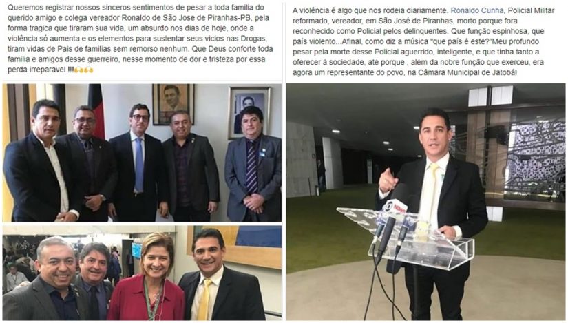 “São José de Piranhas hoje se encontra consternada por um crime que tem em sua essência a mais pura e vil covardia. Independentemente de qualquer coisa, Ronaldo Cunha se mostrava um homem altivo, de posicionamentos firmes e que não titubeava para defendê-los. Qualidade rara e estimável. Uma pessoa coerente e que se mostrou preocupado em trabalhar a vida pública quebrando paradigmas tradicionais na sociedade em que se via inserto. Atrelado a isso, o senso de solidariedade e empatia. Afoito, diziam. Corajoso e combativo, afinal. Em uma de nossas últimas conversa, disse-me que medo e covardia não combinavam nem com polícia e nem com política. E ele vivia os dois. Tinha uma vida inteira pela frente e pelo seu perfil, ainda se faria muito ouvir. Mas sua ousadia e coragem com o instinto de solidariedade, características que o marcavam, levaram à situação na qual a covardia que ele tanto repudiava lhe roubou a vida. Nesse momento absoluta tristeza e dor pela qual sua família e em especial sua companheira de estrada e vida, Silmara, é de se fazer o pedido de que a força dele se irradie e sintam, mas também possam seguir. Aos cidadãos, que saibam reconhecer o valor de alguém que se doou e cujas homenagens são devidas, porém absolutamente insuficientes.”, disse uma das mensagens deixadas em seu Facebook