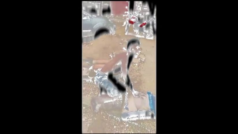 No vídeo, pessoas apenas observam uma sessão de tortura contra um jovem que está carregando um saco de cimento enquanto é espancado por um homem que usa um pedaço de madeira.