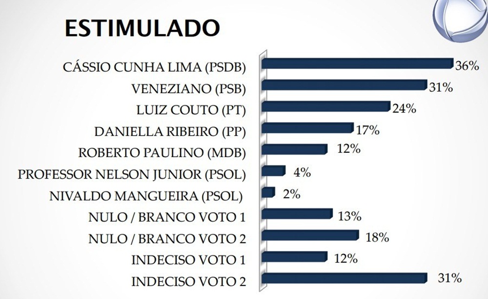 De acordo com os números divulgados Cássio Cunha Lima do PSDB aparece em primeiro lugar com 36% da intenção dos votos, Logo em Seguida vem Veneziano do PSB com 31%; em Terceiro lugar está o Candidato Luiz couto do PT, Daniella Ribeiro do PP aparece em quarto lugar com 17 %, logo após vem Roberto Paulino do MDB com 12% das intenções, O professor Nelson Junior do PSOL ficou com 4%, e Nivaldo Mangueira também do PSOL com 2%.