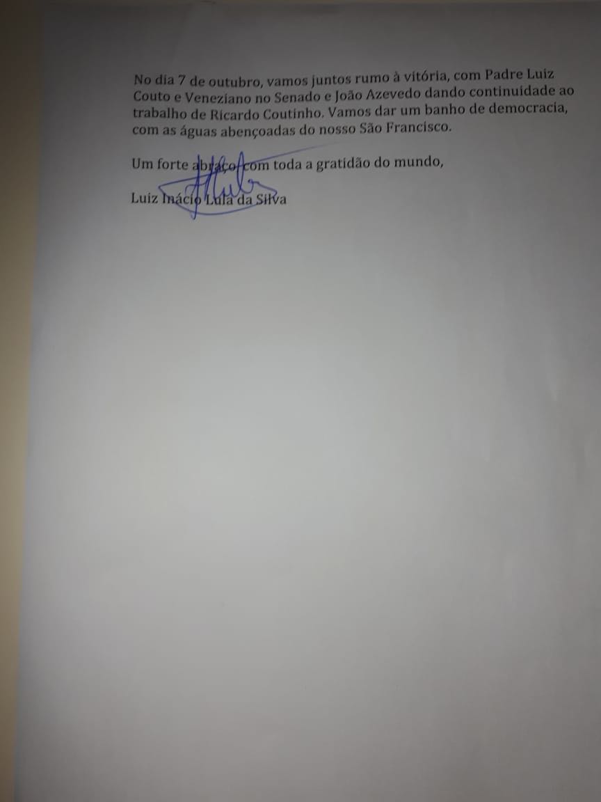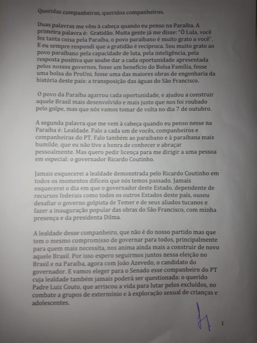 No final da carta, o ex-presidente ainda ressalta as qualidades dos candidatos da chapa encabeçada por João Azevêdo (PSB).