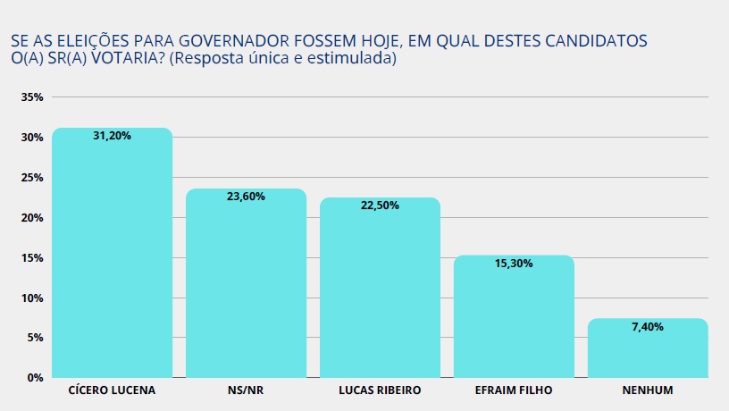 De acordo com os dados da pesquisa estimulada, quando os nomes dos pré-candidatos são apresentados aos entrevistados, o prefeito de João Pessoa, Cícero Lucena (MDB), aparece na liderança com 31,20% das intenções de voto. Em segundo lugar está o vice-governador Lucas Ribeiro (PP), com 22,50%, seguido pelo senador Efraim Filho (União Brasil), que soma 15,30%. Ainda segundo o levantamento, 23,60% dos entrevistados não souberam ou preferiram não responder, enquanto 7,40% afirmaram que não votariam em nenhum dos nomes apresentados.