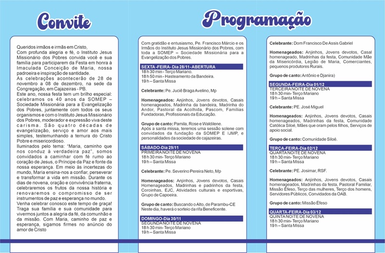 Este ano, a programação ganha um significado especial: a comemoração dos 40 anos de fundação da SOMEP – Sociedade Missionária para a Evangelização dos Pobres, organismo que carrega sua missão de serviço, evangelização e cuidado com os mais simples.
