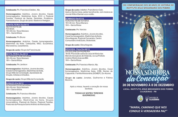 O Instituto Jesus Missionário dos Pobres (IJMP) inicia nesta sexta-feira (28), a tradicional Festa de Nossa Senhora da Conceição. As celebrações seguem até o dia 8 de dezembro, no Instituto, em Cajazeiras, reunindo fiéis, devotos e toda a família missionária para momentos de oração, fé e convivência fraterna.