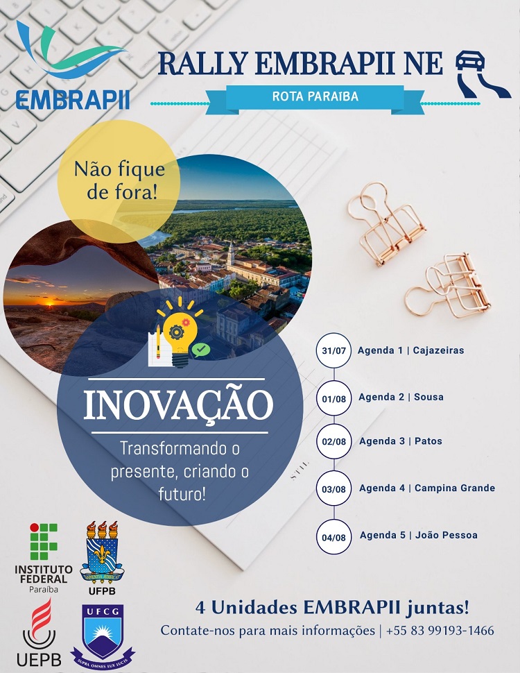 O RALLY EMBRAPII NE – ROTA PARAÍBA acontece nas cidades de Cajazeiras (31/7), Sousa (01/8), Patos (02/8), Campina Grande (03/8) e João Pessoa (04/8), sempre às 19 horas. As inscrições podem ser feitas através do formulário on-line, https://forms.gle/4w1N5nYt5CbX8koBA.