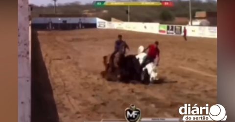 As imagens mostram que no momento em que o vaqueiro tenta derrubar o boi, o seu cavalo tropeça e acaba quebrando o pescoço, fato que resultou na morte imediata do animal