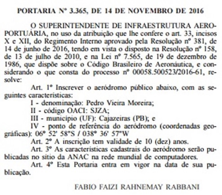 Enquanto isto, em Brasília, uma velha luta, desde o senador Vital do Rego Filho, a partir de sua renúncia para ocupar o Tribunal de Contas da União, tivemos a felicidade de ter como substituto o cajazeirense Raimundo Lira, que tinha um excelente “trânsito” na ANAC, diuturnamente, vigiava a documentação que ia para Brasília e certo dia recebi uma mensagem dele: “27.10.2016, foi uma data acertada ANAC/Governo do Estado da PB. Tranquilize a nossa querida Cajazeiras, estamos na etapa final. Com estima e amizade, Raimundo Lira” . Como a burocracia é imensa, a portaria de Homologação só dia feita no dia 14 de novembro de 2016.