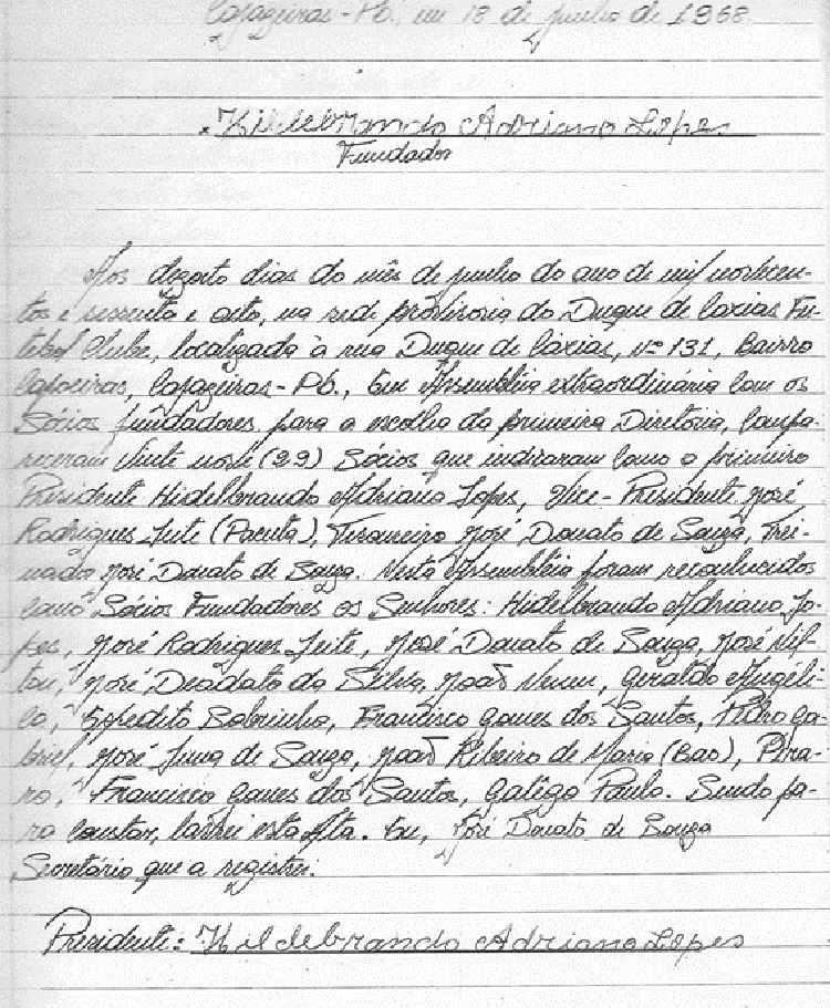 Nesta edição o destaque ficará por conta da fundação de um dos maiores clubes do futebol amador de Cajazeiras, vamos falar do Duque de Caxias Futebol Clube que nasceu em 1968. Pois bem, para início de conversa quando formos falar do “verdão maravilha”, jamais poderemos esquecer de figuras (dirigentes) que se doaram para que este clube se tornasse uma potência, como assim o foi, durante décadas e que nos anos 80 encantasse com o refinamento do futebol extremamente técnico, grande parte dos sertões nordestinos por onde ele desfilava em partidas amistosas ou de competições futebolísticas.