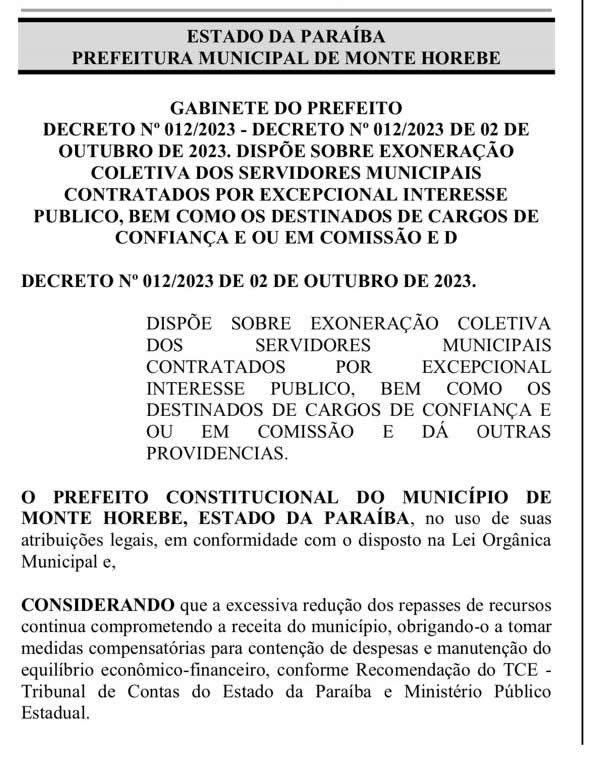 Decreto nº 012/2023: Prefeito de Monte Horebe exonera servidores contratados e comissionados