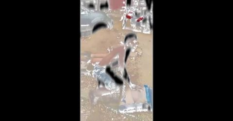 No vídeo, pessoas observam a sessão de tortura contra jovem que está carregando saco de cimento enquanto é espancado por um homem com pedaço de madeira
