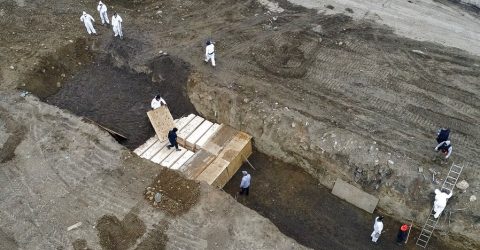 Caixões são empilhados dentro de trincheiras comuns em campo em Hart Island, uma ilha perto do Bronx