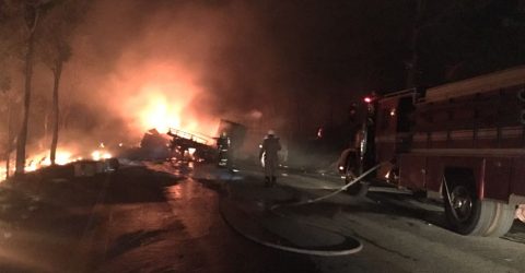 Segundo a PRF, colisão envolveu 8 veículos de carga e um de passeio, que pegaram fogo logo em seguida; vítimas foram carbonizadas. Trecho da pista está completamente interditado.