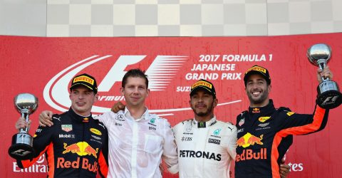 Inglês da Mercedes é ameaçado por holandês da RBR, mas consegue garantir o triunfo no GP do Japão. Vettel abandona com problema em uma das velas e fica distante do título. Massa fecha em 10º