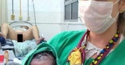 Era para ser apenas uma foto do bebê no colo da enfermeira, mas, ao fundo, é possível ver a mulher deitada com as pernas abertas se recuperando do parto