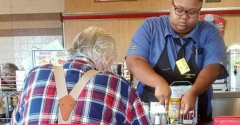 A jovem cortou a carne para o idoso, que tem coordenação motora afetada