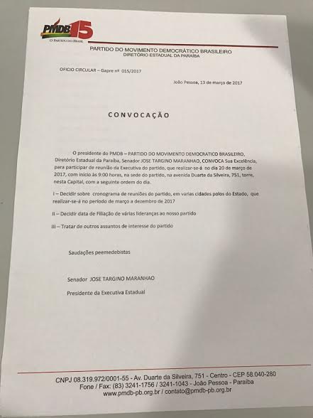 O presidente estadual do PMDB, senador Zé Maranhão, convocou, no início da noite desta segunda-feira (13), reunião da Executiva Estadual do partido para às 9h da próxima segunda-feira (20), na sede do partido, em João Pessoa.