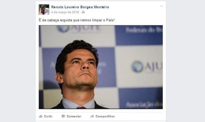 Dias antes de depor à Polícia Federal, ela havia publicado nas redes sociais uma foto do juiz federal Sergio Moro com a seguinte frase: “É de cabeça erguida que iremos limpar o país!”.