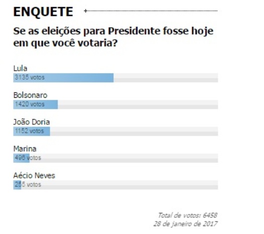 Perguntada ‘Se as eleições para presidente fossem hoje em quem você votaria?” A maioria, representada por 3135 ‘votos’ disse que votaria no ex-presidente Lula, que ficou no topo da ‘pesquisa’